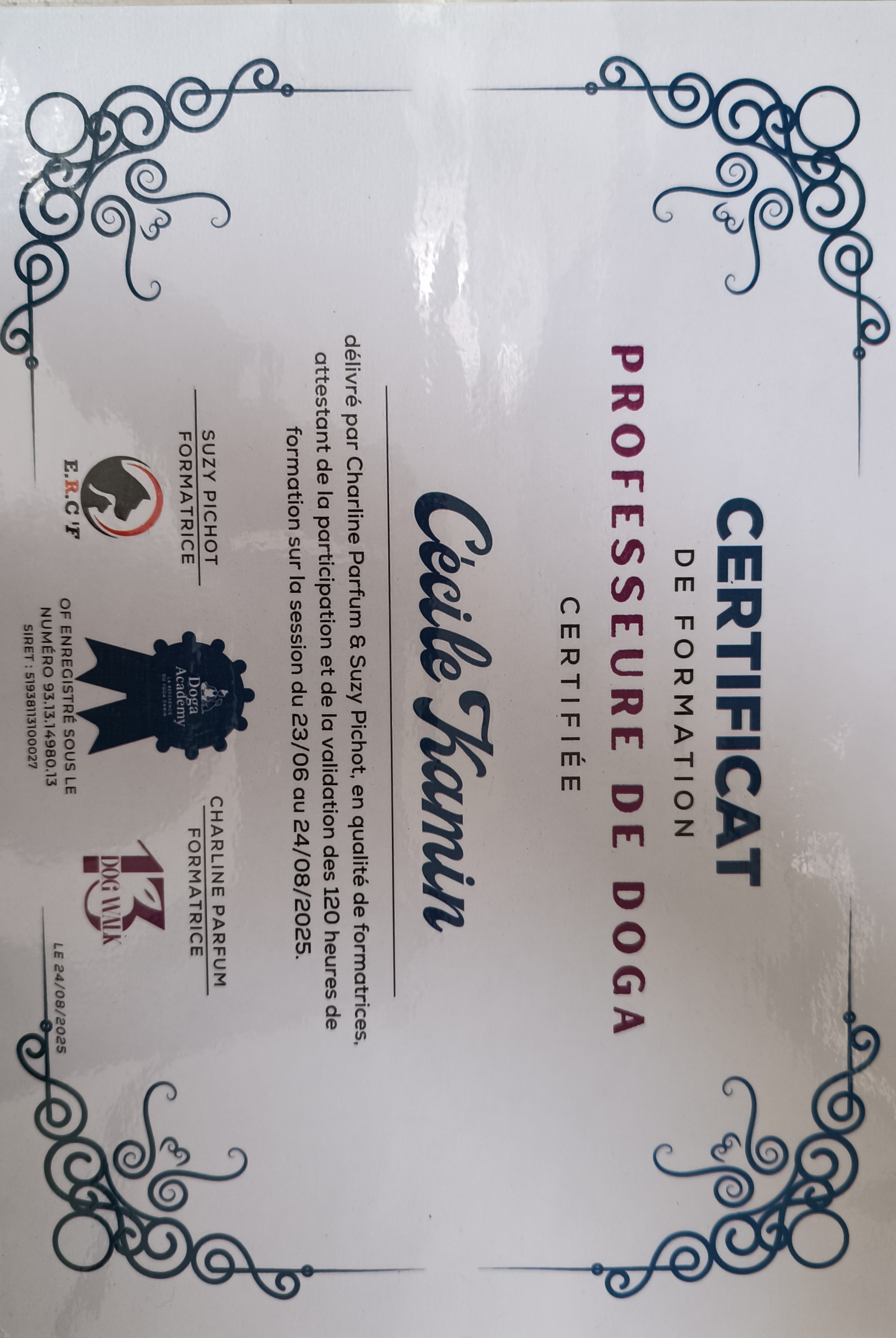 Cette certification professionnelle (ERC & Dog Walk 13) atteste d’une formation dédiée au Doga et d’une évaluation des compétences (validation des protocoles de sécurité et de bien-être). Le Doga est une pratique de bien-être qui associe yoga doux, respiration, mobilité et proprioception avec son chien : une approche ludique et accessible qui renforce le lien du binôme, dans le respect du rythme et du consentement de l’animal.
